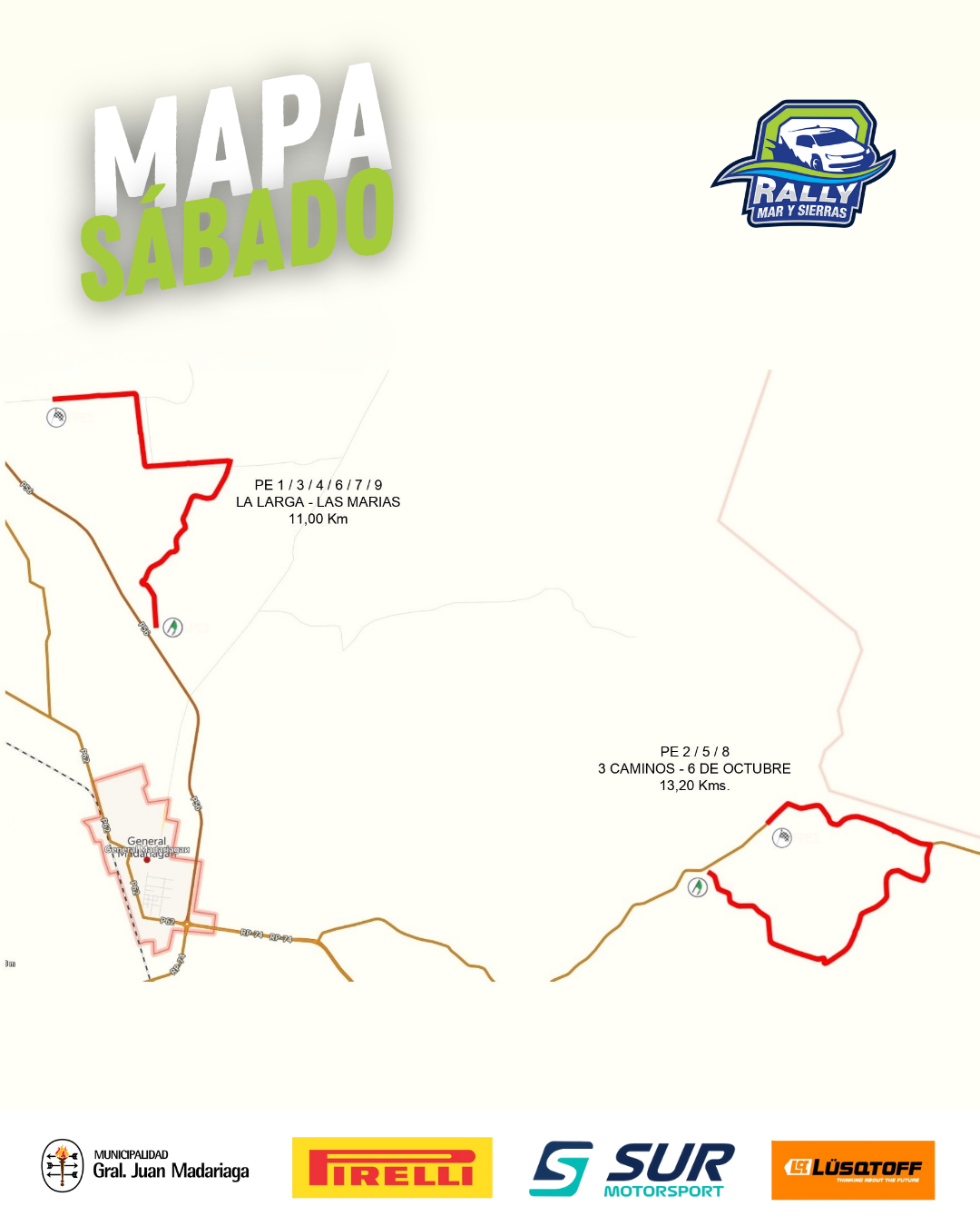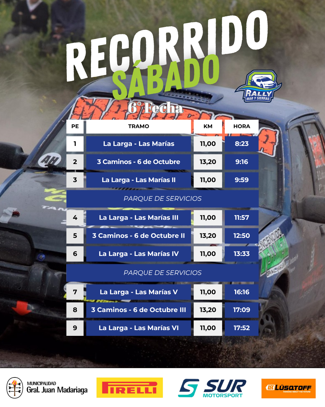 En cuento al recorrido de la carrera del sábado, cada uno de los tres rulos comenzará con la Prueba Especial La Larga – Las Marias de 11 kilómetros cronometrados, pasando luego por el clásico de Horcones, 3 Caminos – 6 de Octubre (13,20 Km), para terminar con un nuevo recorrido por el primero, sin pasar por el Parque de asistencia; por lo que serán seis pasadas por La Larga y tres por 3 Caminos en el total del día, sumando 105, 60 km de velocidad y 263 de enlaces.