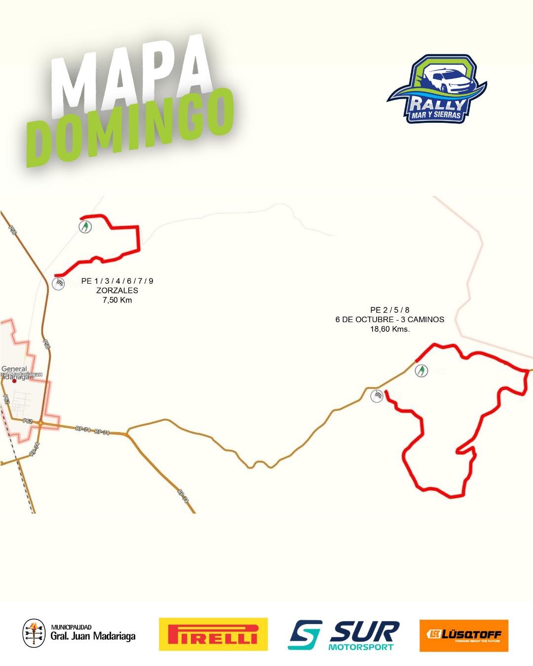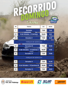 Por su parte el domingo pasará algo similar con el tramo cronometrado denominado Zorzales (7,50 Km) que abrirá y cerrará cada uno de los rulos, quedando 6 de Octubre – 3 Caminos (18,60) en el medio, lo que suma 100,80 km de velocidad y 185,70 de enlaces.